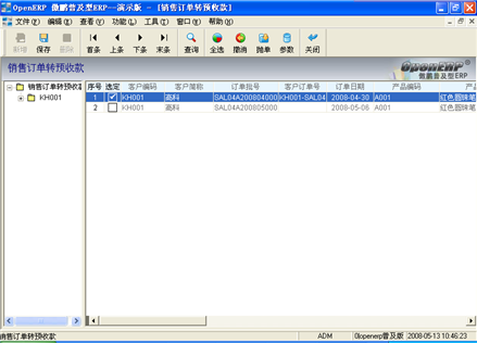 登錄系統後,在左邊的樹(shù)型圖中,找到“應收管理(lǐ)/預收帳款/銷售訂單轉預收款”後雙擊它,進入“銷售訂單轉預收款”窗口(見圖11),此文件櫃将銷售訂單生(shēng)成預收款單據