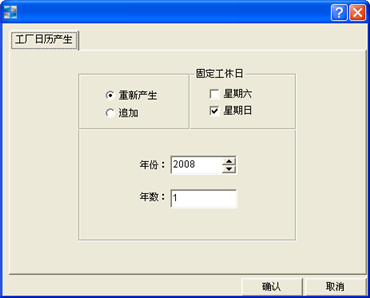 登錄“工廠日曆”窗口後,在菜單欄按“功能/工廠日曆設定”的功能鍵,彈出如圖3的窗口。設置工廠日曆産生(shēng)的方式,設置固定工作(zuò)日,輸入初始年份和(hé)年數(shù),點“确認”後,系統根據設定的自動産生(shēng)新的工廠日曆,寫到圖2下表中