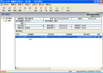 登錄系統後,在左邊的模塊區(qū)中,找到“庫存管理(lǐ)/暫收處理(lǐ) /委外暫收”,進入“委外暫收”窗口(見圖10),此文件櫃可(kě)以手動新建委外暫收單據(注意:必須有(yǒu)委外訂單),也可(kě)對由委外訂單生(shēng)成的委外暫收單進行(xíng)查看、修改,然後将單據審核