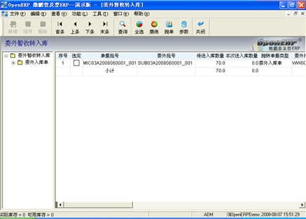 具體(tǐ)操作(zuò):選定需要轉成委外入庫單的記錄後,點擊菜單項“功能/抛出”或點擊相應圖标,将選定的暫收批号轉成委外入庫單