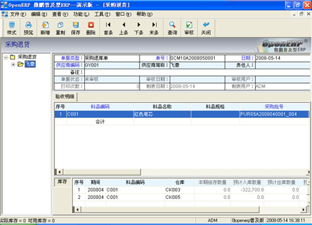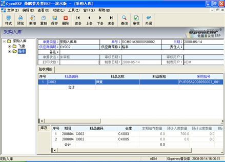 登錄系統後,在左邊的模塊區(qū)中,找到“庫存管理(lǐ)/采購入退庫/采購入庫”,進入“采購入庫”窗口(見圖14)此文件櫃可(kě)以手動新建采購入庫單據(注意:必須有(yǒu)采購訂單),也可(kě)對由采購訂單生(shēng)成的采購入庫單和(hé)采購暫收單生(shēng)成的采購入庫單和(hé)采購拒收退回單進行(xíng)查看、修改,然後将單據審核