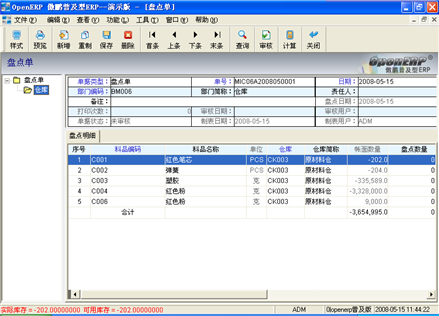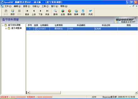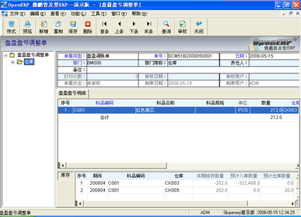 登錄系統後,在左邊的樹(shù)型圖中,找到“庫存管理(lǐ)/庫存盤點/盤盈盤虧調整單”,進入“盤盈盤虧調整單”窗口(見圖42),此文件櫃可(kě)以新建庫存數(shù)量調整單據,也可(kě)對由盤赢資料調整、盤虧資料調整生(shēng)成的單據進行(xíng)查看、修改,然後将單據審核。盤盈盤虧調賬是指當庫存帳不準時(shí),可(kě)通(tōng)過此文件櫃對庫存帳進行(xíng)調整