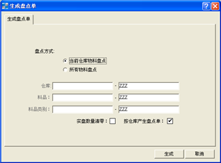 登錄系統後,在左邊的模塊區(qū)中,找到“庫存管理(lǐ)/庫存盤點/生(shēng)成盤點單”,進入“生(shēng)成盤點單”窗口(見圖37),此文件櫃可(kě)以自動生(shēng)成盤點單據。