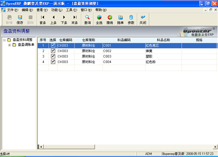 登錄系統後,在左邊的模塊區(qū)中,找到“庫存管理(lǐ)/庫存盤點/盤赢資料調整”,進入“盤赢資料調整”窗口(見圖40),此文件櫃可(kě)以将盤點單中盤赢料品資料生(shēng)成盤盈盤虧調整單