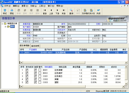 成本計(jì)算(suàn):系統自動根據物料明(míng)細的最新采購價計(jì)算(suàn)出此産品的報價成本,自動換算(suàn)成報價币别金額回寫到右中窗口上(shàng)的單價欄位上(shàng)